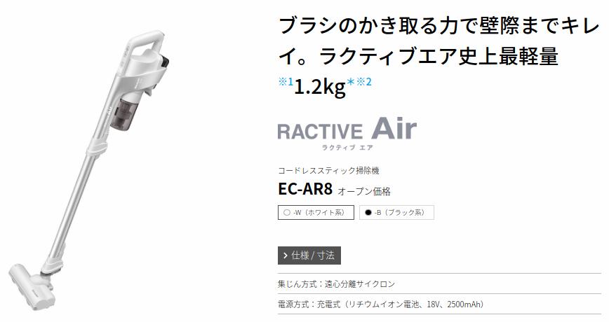 この機種の前に使っていたのが、3kg近い重さがあって取り回しが悪かったこともあり、RACTIVE Air EC-AR8にしてストレスなく使えているようです。