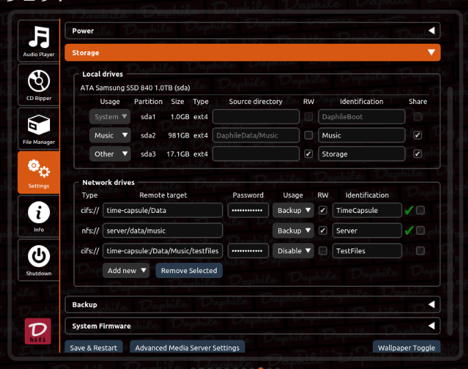 デフォルトでは、「DaphileDataパーティション」が音楽用のストレージとして指定されています。